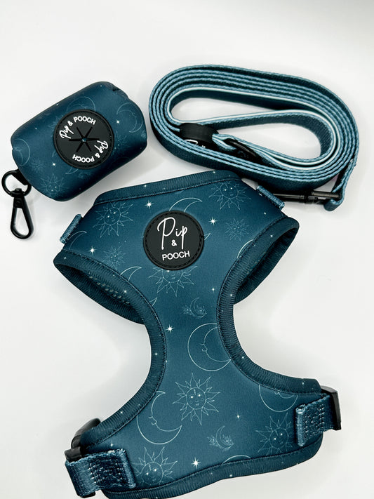 Bundle - Dog Harness, Lead & Poo Bag Holder Set - Celestial Dark Teal